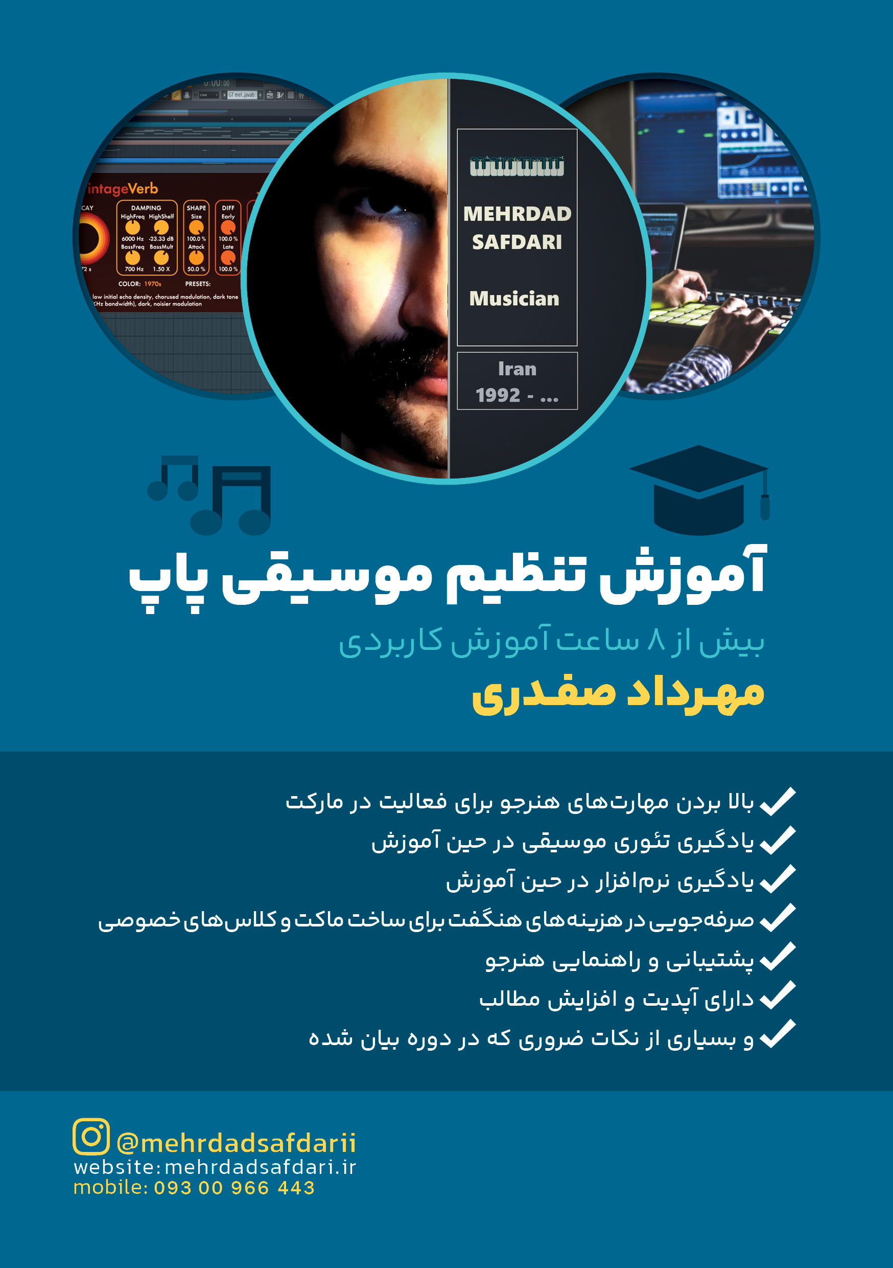 در دوره تنظیم موسیقی پاپ، تکنیک های تعیین فرکانسی، تعیین کسر میزان، نوشتن بیس به چند روش، چیدن درامز، پاساژ در لاین های مختلف، فضاسازی، آرپژ پیانو، آرپژ گیتار، ریتم گیتار به چند شکل مختلف، میکس وکال و بک وکال و تکنیک های متعدد دیگر!