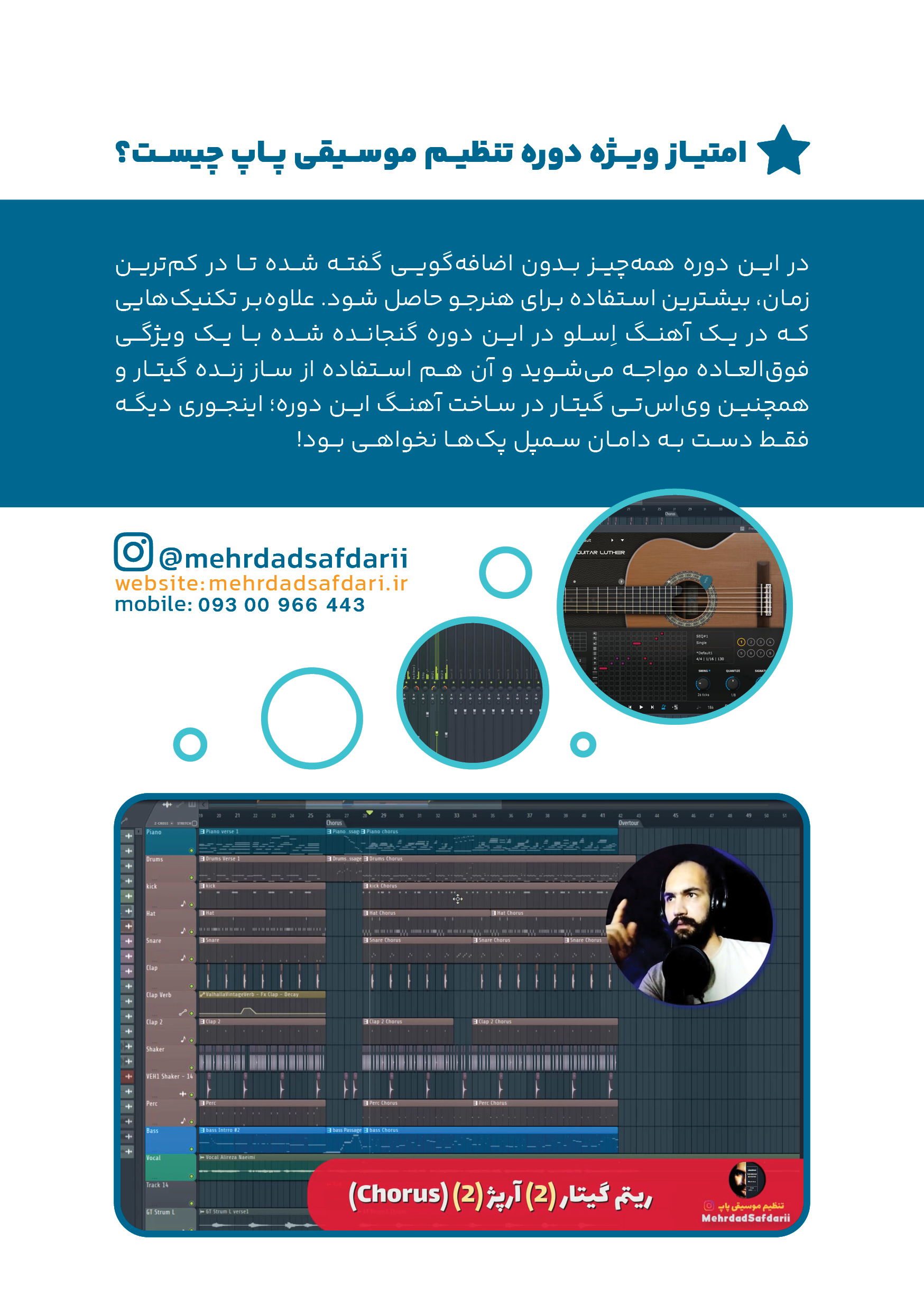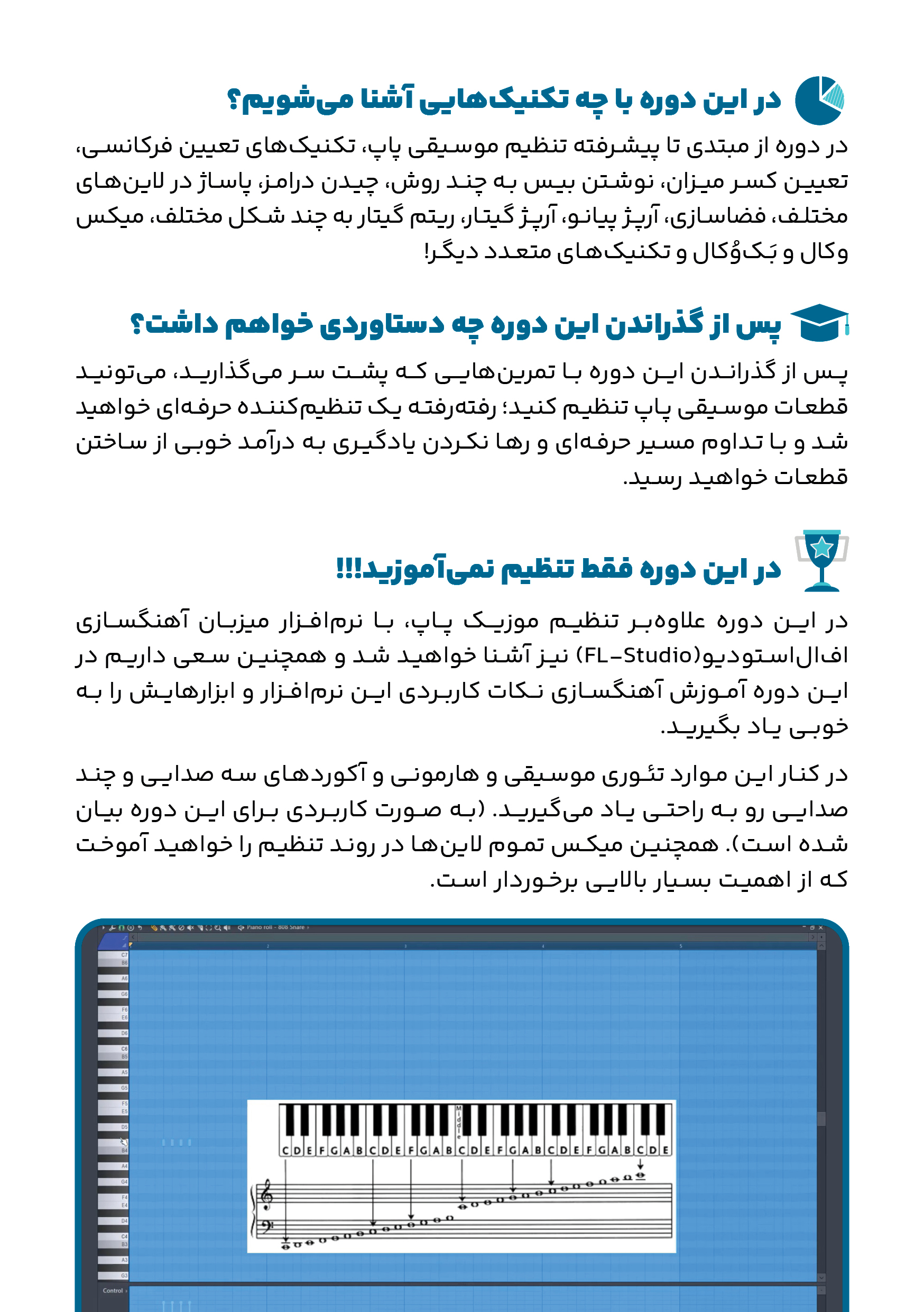 - بلــه در فصــل اول بــه صــورت کاربــردی تئــوری موســیقی و بــه روش بســیار آســان آکوردها رو آموزش دادیم و در همین فصل با نرم افزار اف ال استودیو آشنا میشیم. در این باره اصلا نگران نباشید چرا که پشتیبانی برای پاسخ به مسائل احتمالی شما وجود دارد.